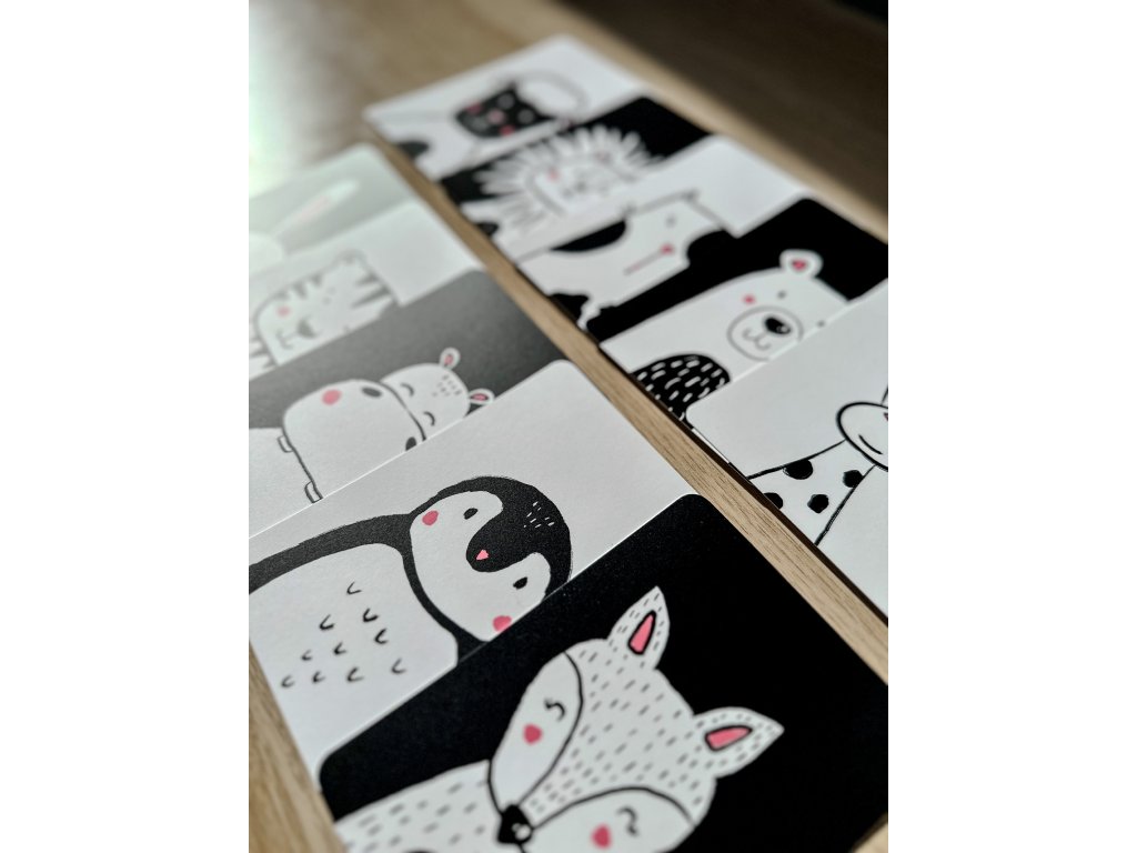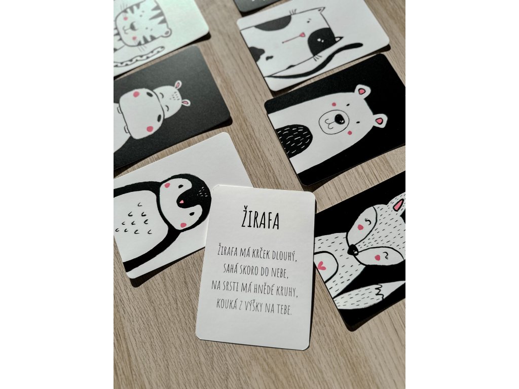 Kontrastní kartičky se zvířátky a říkankami jsou navržené pro první objevování, pozorování i společné chvíle rodičů s dětmi. Každá kartička obsahuje z jedné strany jednoduchý kontrastní obrázek zvířátka, který upoutá dětskou pozornost, a z druhé strany krátkou říkanku, která podporuje vnímání řeči, rytmu a zvukomalebnosti slov.